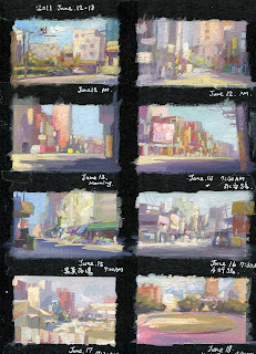 These paintings were done in small scale about 2"by 3"each. So I can paint fast in one location and move to the other. The advantage for small scale painting is that I can do a whole bunch of color studies in different time and places. Usually, I like to paint one before work in the morning during the weekdays. In the weekend, I have whole day to paint far away from home such as mountain, port or market. This is a good way to practice the painting skill. I will paint bigger scale later on.